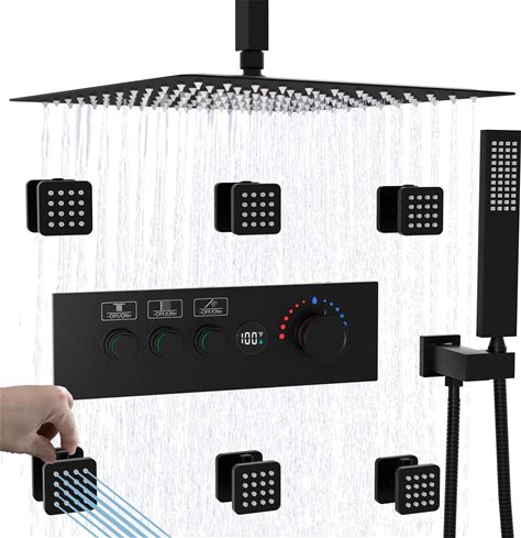 Matte Black Thermostatic Rainfall Shower System With Handheld, Large Rain Shower Head & Trim, Galiano Remer SFR43 By Nameeks
