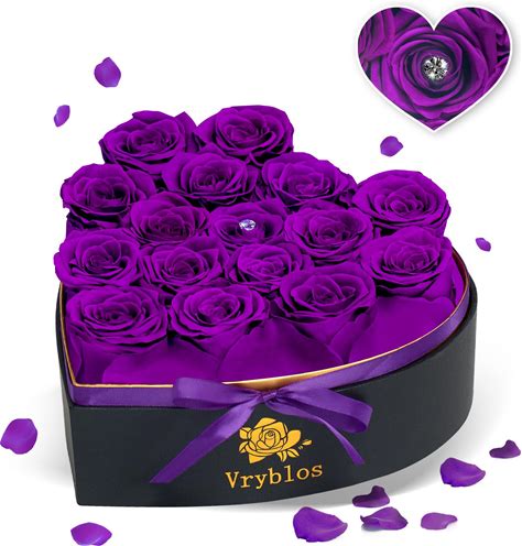 Vryblos 16 Pieces Forever Flower Heart Shape In A Box Preserved Purple Roses For Delivery Grade A Quality 100% Real Immortal Flowers Eternal Birthday