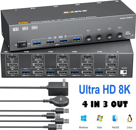 8K@60Hz/4K@144Hz HDMI Displayport KVM Switch 3 Monitors 4 PC, USB 3.0 KVM Switches With Wired Remote
