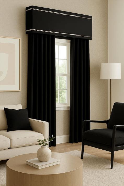 Custom Cornice Board Pelmet Box Window Treatment In Black With Silver Nailhead Trim - Custom Curtain Box In Modern Black With Nail Head