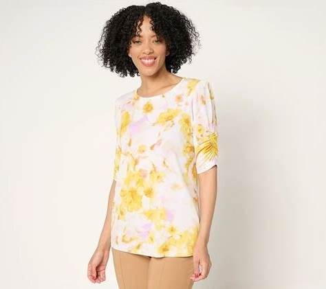 Susan Graver Printed Liquid Knit Crew Neck Top W/Ruched Sleeve, Size Medium, Lemon